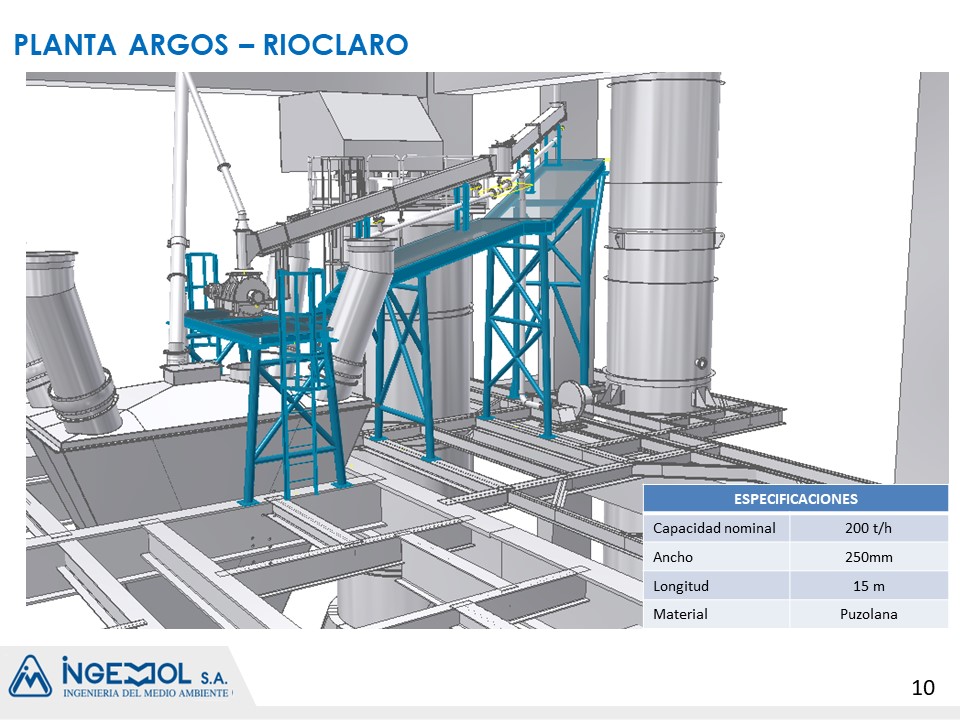 INGEMOL S.A. Desarrollo un sistema de transporte de cemento con un longitud de 15 Mts transportando una capacidad nominal de 200 t/h
