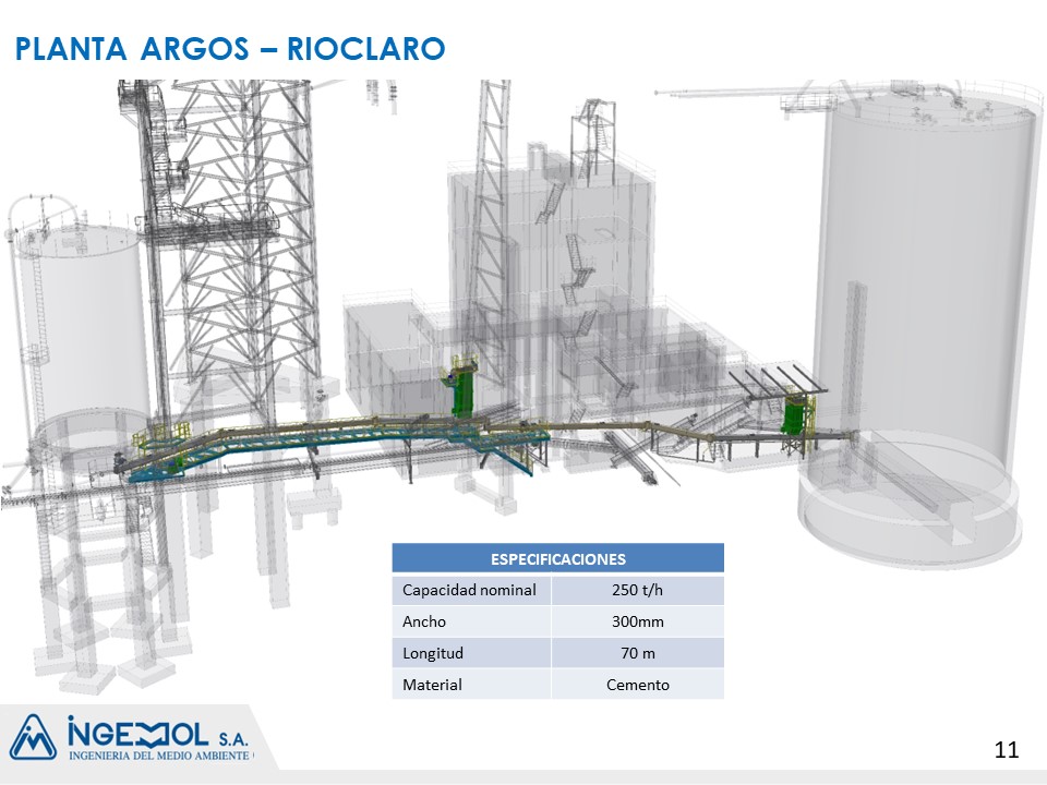 INGEMOL S.A. Desarrollo un sistema de transporte de cemento con un longitud de 70 Mts transportando una capacidad nominal de 250 t/h