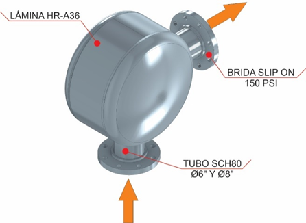 Fabricado en lámina anti desgaste HARDOX-450 para proteger contra el desgaste durante el transporte de materiales altamente abrasivos. Equipado con salidas en tubo SCH 80 para conexiones mediante brida. Incluye acoples tipo brida con pernos de sujeción y empaque interno anti-fugas. Además, cuenta con una compuerta de inspección para facilitar la revisión y el desatasque