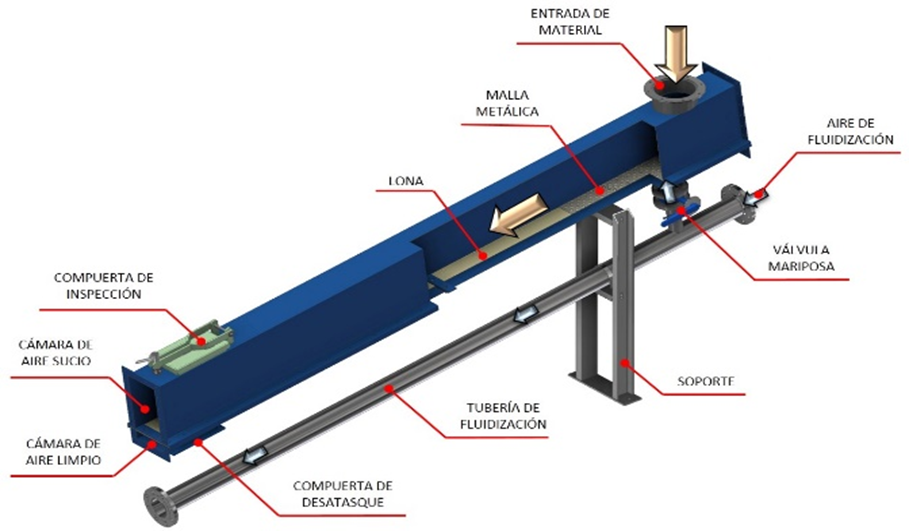 El aire penetra a través del medio poroso y fluidiza el material permitiendo que se deslice o corra y crea un flujo continuo desde la entrada hasta la salida.