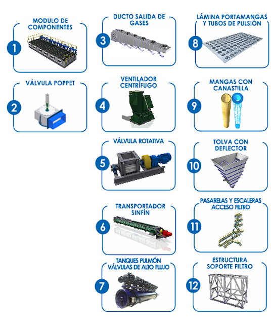 Especialistas en la fabricación de filtros de mangas tipo jet-pulse, siendo los sistemas mas confiables en el mercado con eficiencias hasta de 99.95%